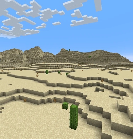 В пустыне почти нет растений — есть только кактусы и сухие кусты. В этом биоме в основном обитают только кролики; однако, если игрок нашёл деревню, то может встретить там жителей, кошек, коров, овец и свиней. Пустыня имеет в основном плоский рельеф, поверхность которого состоит из песка. Для того, чтобы песок не падал в пещеры, под ним генерируется песчаник. Здесь нет многих полезных ресурсов, которые можно было бы найти в других биомах, но зато в пустыне находится большое количество структур: деревень, храмов, ископаемых останков, колодцев и аванпостов разбойников. Деревни и храмы могут послужить временным жилищем и хорошим источником ценных предметов. Кроме рек, воду можно найти в деревнях и колодцах. Если раскопать ископаемые останки, то можно добыть много костных блоков и костной муки. Аванпосты разбойников — единственные источники древесины на поверхности пустыни.