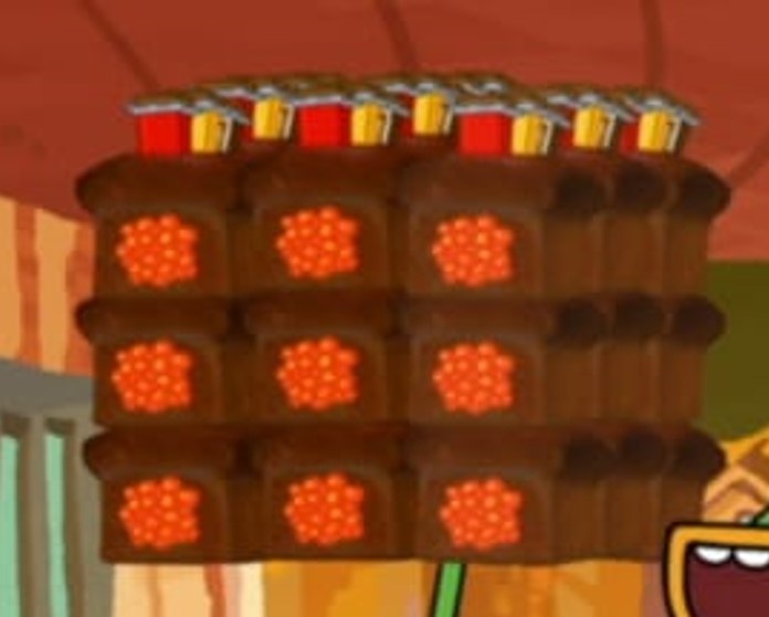 Темно-коричневая буханка хлеба с тремя плитками шоколада, воткнутыми сверху, и красной икрой в корке. Был заказан Ти-Миди для матери в серии "Братский загул".