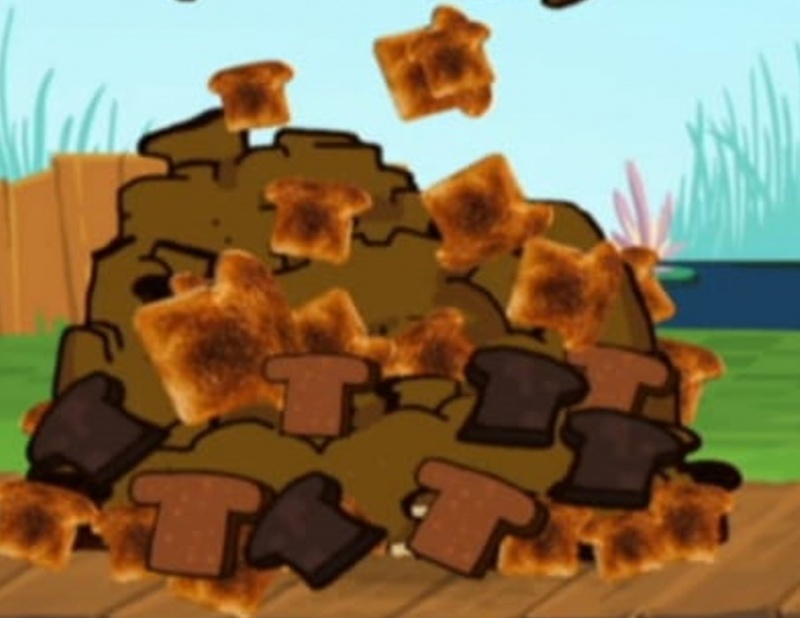 Подгоревший хлеб больше по консистенции напоминает тост, но более чернее. Подгоревшим на деле оказался Хлебопечник со словом "Подгорел", когда Быдыщ отравил его своим вонючим дыханием. В итоге Хлебопечник рассыпался не обычнм хлебом, когда исчез, а подгоревшим. Хлеб появился в серии "Вонь изо рта".