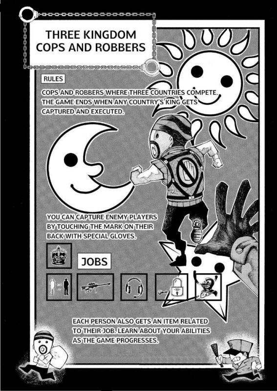 Три королевства «Полицейские и воры» — третья игра-испытание, проводимое Манной. Игроки разделены на три группы (три королевства) по 1200 человек: «Звезда», «Луна», «Солнце». У каждого королевства есть свой штаб — школа, на территории которого находится темница с тремя камерами. Все пойманные вражеские игроки помещаются в них. Каждые шесть часов проводится казнь. Поймать вражеского игрока можно, коснувшись метки на его спине рукой. Для этого нужно надеть специальные перчатки. Игроки, находящиеся в камерах к моменту, когда время на песочных часах истекает, умирают.