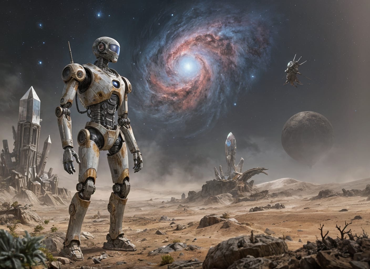 Одинокий, потрепанный временем робот стоит на пустынной, продуваемой всеми ветрами чужой планете, глядя на далекую, яркую туманность. Робот покрыт ржавчиной и сложными кибернетическими усовершенствованиями, что говорит о долгом и трудном путешествии. Пейзаж представлен странными кристаллическими скальными образованиями и редкой инопланетной флорой. Он выполнен в суровом, гиперреалистичном стиле концепт-арта, подчеркивающем суровую окружающую среду и изоляцию робота, с приглушенной цветовой палитрой, подчеркнутой яркими оттенками звездной туманности. ![]() 4 Показать 5 комментариев |