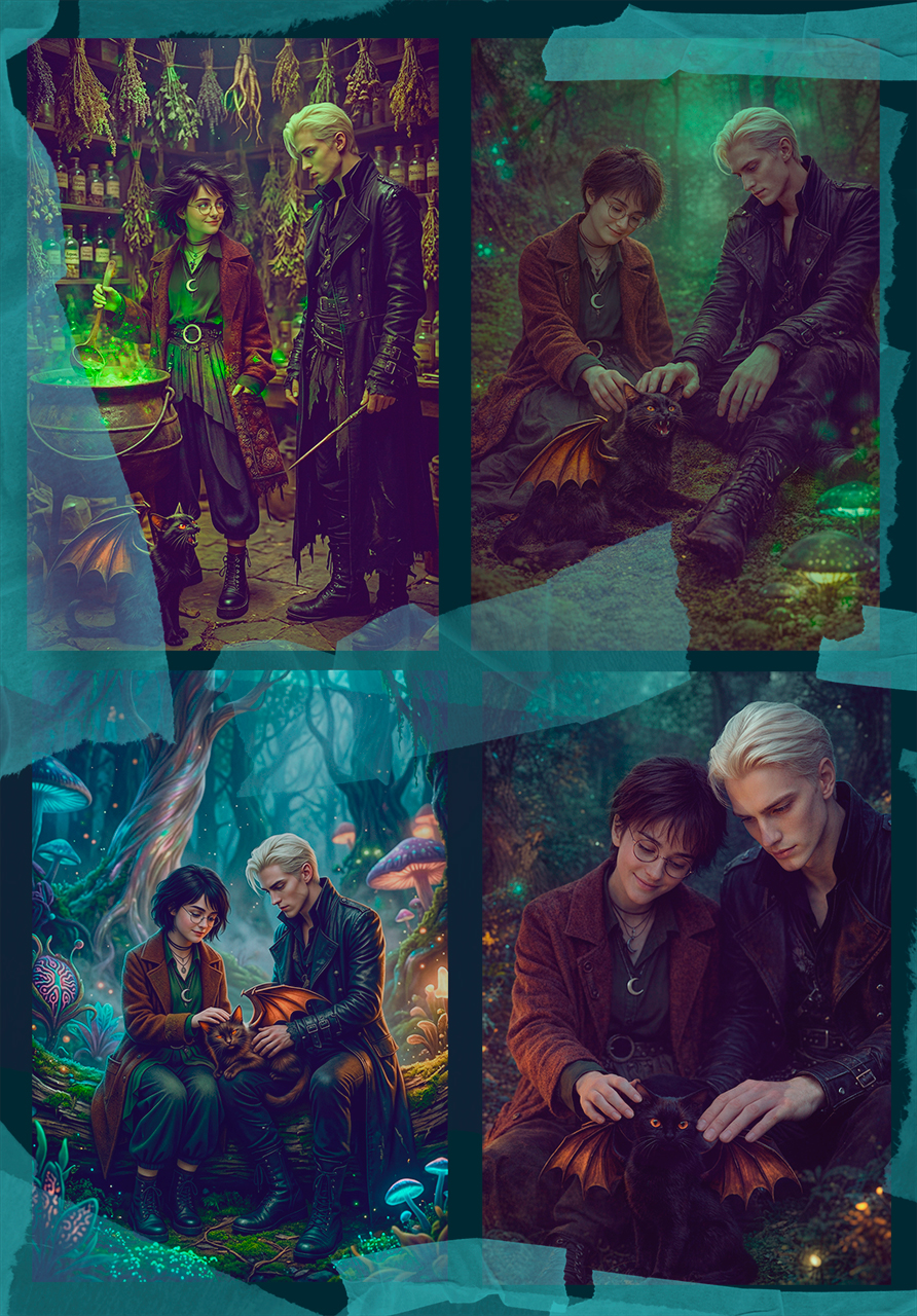 Один промт — разные модели. Лицо у блондина — это лицо Драко, и длинноносый брюнет — это лицо Северуса, я их генерировала и теперь подгружаю в промты, поэтому здесь они такие одинаковые =) ![]() Показать полностью