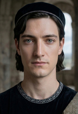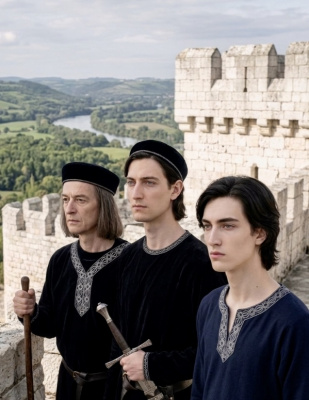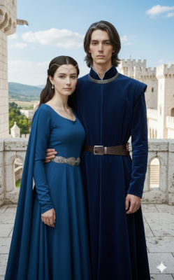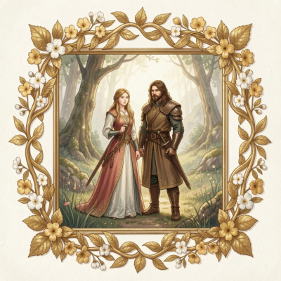 "Портрет Арвен и Арагорна в цветущем золотом лесу, в тонкой раме с эльфийским узором. Лица крупным планом. Арвен в светло-зелёном платье с серебром, Арагорн в серебристом плаще. Влюблённые смотрят друг на друга с нежностью. Вечер, сумерки, закат. Старинная живопись, иллюстрация к средневековой рукописи"