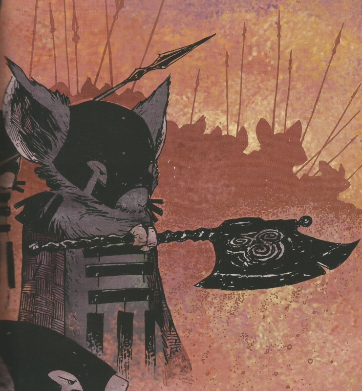 Служил в качестве стражника до и после войны с ласками 1149 года. Также исполнял роль оружейника Мышиной Гвардии. Стремился свергнуть Гвендолин и править всеми мышами с армией последователей. Объединил свою армию символом защиты: оружием, известным как Чёрный топор.