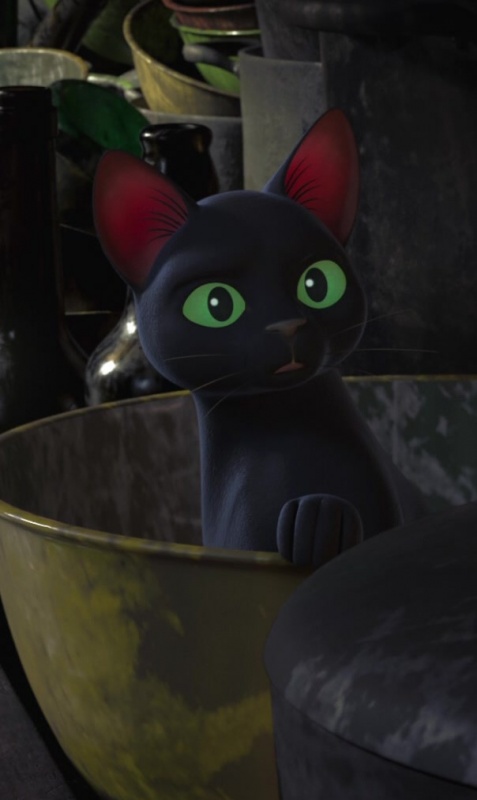 Томас — полностью черный кот с зелеными глазами.