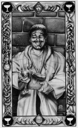 "Высокий, мощный мужчина смотрел на меня со следующей карты. Очень похож на меня, только подбородок тяжелее, и я знал, что он больше меня, хотя значительно медлительнее. О его силе ходили легенды. Он одет в серо-голубой костюм с широким черным поясом, и он стоял и смеялся. Вокруг его шеи на широкой цепи висел серебряный охотничий рог. Борода была коротко подстрижена, в правой руке кубок с вином. Почувствовав к нему внезапную привязанность, я вспомнил и его имя. Его звали Жерар." (Корвин)