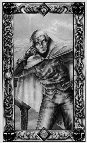 "...хитрый маленький человечек с острым носом, смеющимся ртом и копной соломенных волос. Он был одет в нечто, напоминающее костюмы Ренессанса, желтых, красных и коричневых тонов — длинный плащ-накидка и короткая обтягивающая кожаная куртка. Я знал его. Его звали Рэндом." (Корвин)