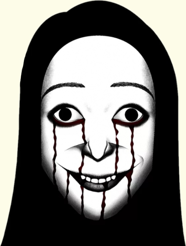 Женщина с аккуратными черными волосами, абсолютно белой кожей и жуткой улыбкой. Кровь течет из ее глаз и рта.
