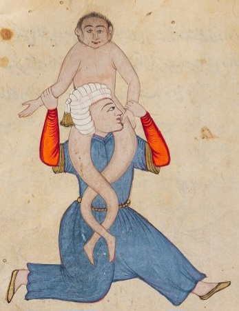 Злой демон, людоед. Имеет человеческое туловище и длинные хвосты вместо ног. Нападает на человека, обвивает хвостами и ездит, пока жертва не ослабнет, затем душит и съедает.
