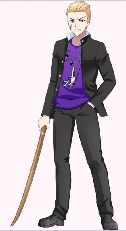 Он носит стандартную школьную форму с расстегнутым пиджаком, открывающим вид на фиолетовую рубашку с пистолетом, стреляющим черной жидкостью, пирсинг в виде спирали на левом ухе и оружейный ящик на спине, в котором находится боккен, если игрок не настроит его по своему усмотрению.