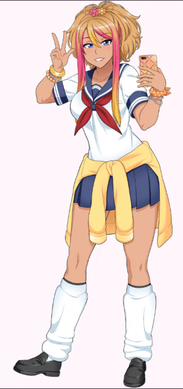 Она носит стандартную школьную форму с жемчужной лентой для волос и розово-желтым цветком на макушке, золотыми серьгами-обручем, темно-бордовыми акриловыми ногтями, тремя розово-желтыми резинками для волос на обоих запястьях, оранжевой сумкой для книг на левом плече, желтой курткой, завязанной на талии, и белыми гетрами, если только настраивается игроком, хотя она носит более короткую юбку. Ее чехол для телефона ярко-желтого цвета украшен жемчугом и тремя розовыми цветочками, а снизу к нему прикреплен брелок для телефона в виде желтого цветка.