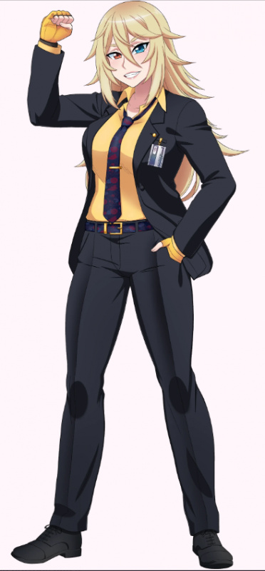 Она носит желтую рубашку, черный пиджак с золотыми пуговицами и сине-красный пояс с золотой пряжкой. На ней черные брюки и туфли. На ней также сине-красный галстук с золотой заколкой в тон ремню. На руках у нее желтые и черные перчатки бойца ММА без пальцев. К пиджаку спереди прикреплено удостоверение личности, похожее на значок.