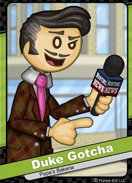 Харизматичный репортёр Nowtime News, лицо группы журналистов-расследователей, известной как «Команда Готча», в которую входят он сам и его коллега Шеннон. Его «Команда Готча» еженедельно выпускает специальные репортажи, в которых они раскрывают различные случаи мошенничества, коррупции и незаконной деятельности в регионе. Дюк получил премию Windie за свой нашумевший репортаж «Таинственное мясо», в котором он расследовал сомнительные источники поставок "Мясных пирогов Мортаделло". Дюк заканчивает каждое расследование своей знаменитой фразой «Что ж, похоже, снова Дюк... ПОЙМАЛ!»