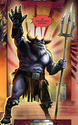 Из одежды у него только пояс с черепами и тканью, прикрывающей промежность. А также наколенники и наручи. В левой руке держит трезубец.