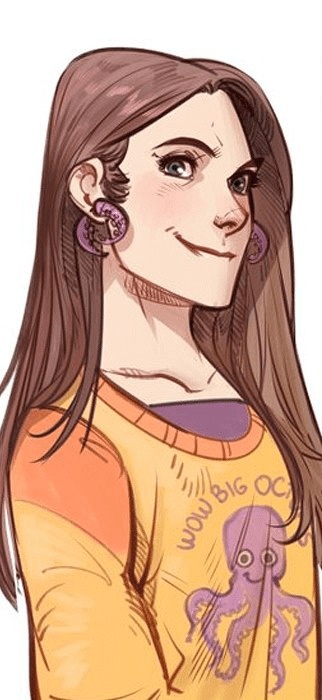 Маленькая худенькая девушка. Брюнетка с зелёными глазами. Красит губы красной помадой, носит кулон и круглые серьги.
