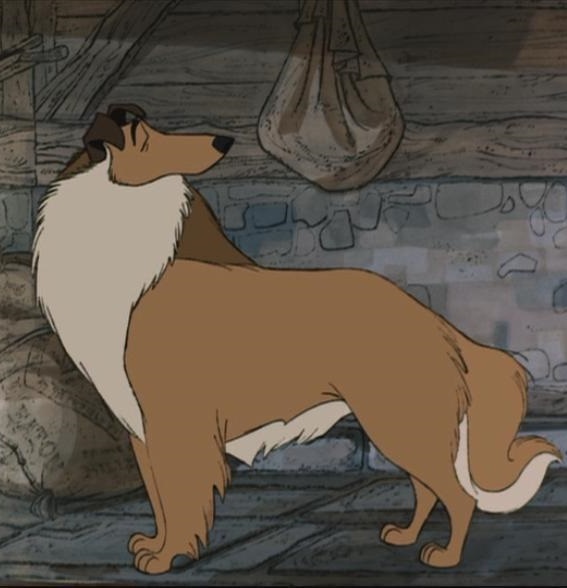 Колли, один из псов, что помогает Понго и его семье вернуться домой. Он предлагает переждать метель в коровнике и приносит взрослым далматинцам свой ужин.