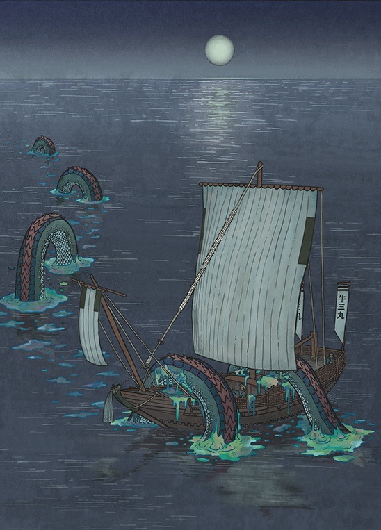 Икути — огромные морские чудовища, которые странствуют в открытом море у берегов Японии. В эпоху Эдо бытовало множество историй, где они описывались как огромные рыбы или какие-то морские змеи. Их тела покрыты скользким маслом, которое распространяется вокруг, когда они плывут в океане.