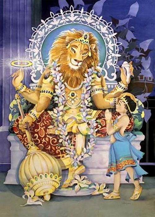 Согласно Пуранам, Нарасимха явился около 3,5 млн лет назад, в Сатья-югу, в форме человекольва — существа с человеческим туловищем и львиной головой. Поклонение Нарасимхе широко распространено среди последователей традиции вайшнавизма, которые считают его «великим защитником» — воплощением Вишну, особой миссией которого является защита своих преданных. В индуизме Нарасимха рассматривается как олицетворение божественного гнева.