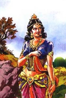 Вместо этого она, с помощью своей мистической силы, превратилась в высокую, невероятно красивую женщину, одетую в изысканные одежды и украшенную гирляндами цветов, и в таком виде предстала перед Пандавами.