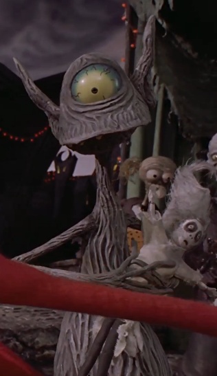 Житель городка "Хэллоуин", приходит в восторг от снега, который дарит жителям городка Санта-Клаус.