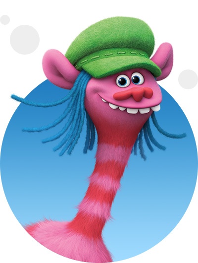 Самый необычный тролль в деревне троллей. Ходит на четырех ногах, похож на жирафа, какает кексиками. Один из близких друзей Розочки, похищенный Поварихой.