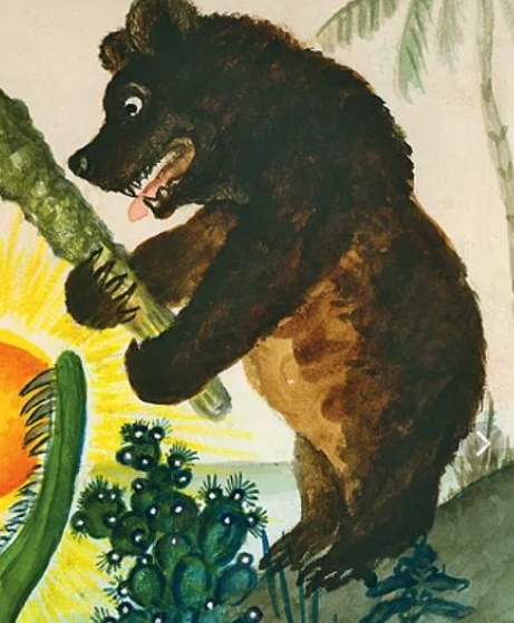 В третьей — захотел побывать на Луне и попросил крыльев у разных птиц. Внуки-медвежата фигурируют и тут.