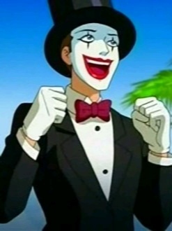 Он носит старомодный чёрный смокинг, грим клоуна, плащ, темно-красные штаны и цилиндр.