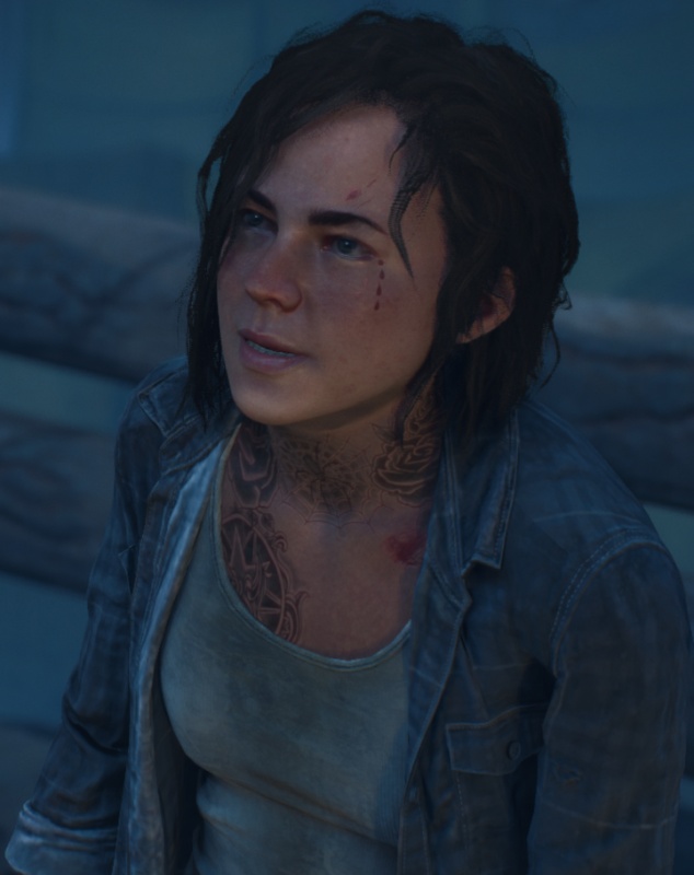 До апокалипсиса сидела в тюрьме. Скорее всего, за убийство, о чем можно судить по трем татуировкам слезинок под ее левым глазом (количество убитых). Попала в трудовой лагерь Гаррета, откуда сбежала.