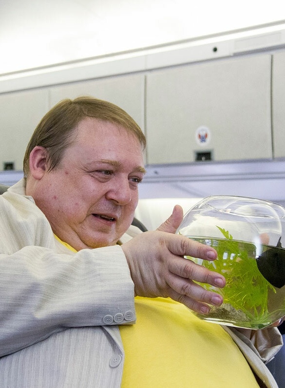 Постоянный клиент компании "Аэрослон". Очень боиться летать, но пересиливает себя и летает без снотворного, благодаря необходимости заботиться о рыбках в аквариуме, которых он берет с собой в полёт. Рыбки в аквариуме с каждым перелетом меняются.