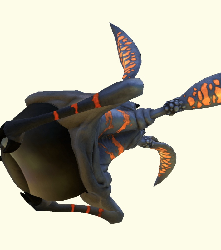 Существо темно-синего цвета с оранжевыми полосками на теле. Имеет три ноги, мощные мышцы помогают существу преодолевать большое расстояние через воду, также хорошо передвигаться с помощью них по дну моря.