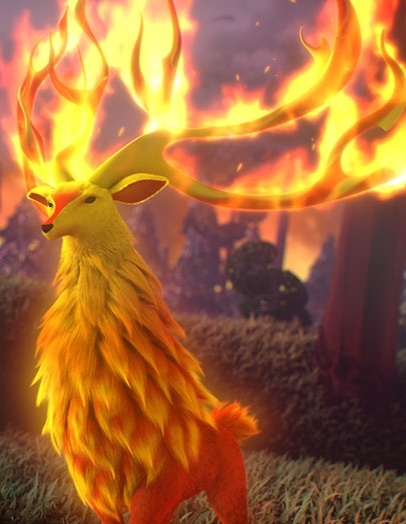 Дух, воплощение огня. Олицетворяет огонь и лесные пожары. Он появляется во время каждой летней грозы ― спускается на землю с облаков. По легенде, гром ― это топот его копыт, а молнии ― отблеск его серебряных рогов. "С Красным Оленем шутки плохи!" ― говорил зверятам Мапа Пандига, ведь Красный Олень безжалостен и вечно голоден...