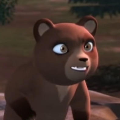 Бурый медвежонок с рыжеватым пятном шерсти на левом глазу. Он также думает о еде и будет просить ее. Он также гордится тем, что он медведь гризли, но также чувствителен.