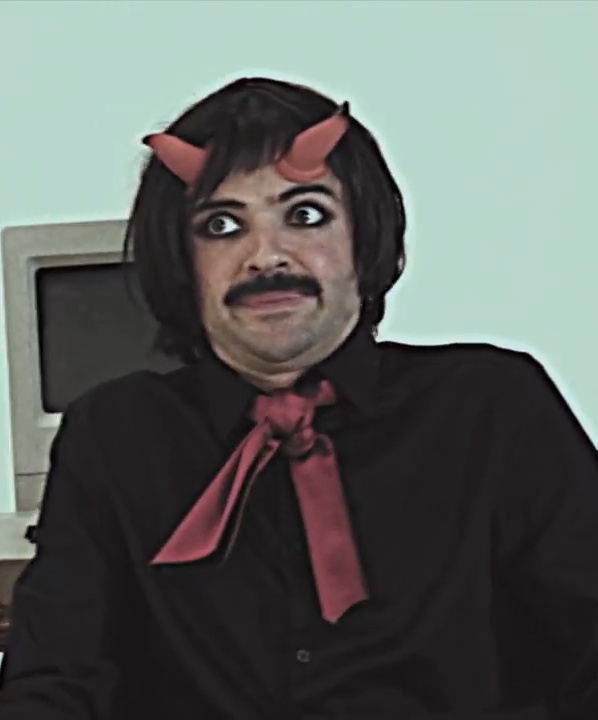 Сын Сатаны одет в чёрный костюм с красным галстуком. Учится в школе и занимается музыкой. Картавый. У него есть рога на голове, как и у других чертей.