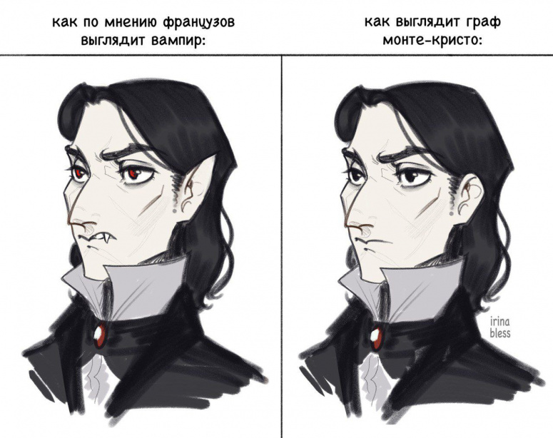 Мне так понравилось, как светское сборище во всех чертах описали вампира, а потом вошёл точно такой же граф и все испугались. Французы такие французы 😁