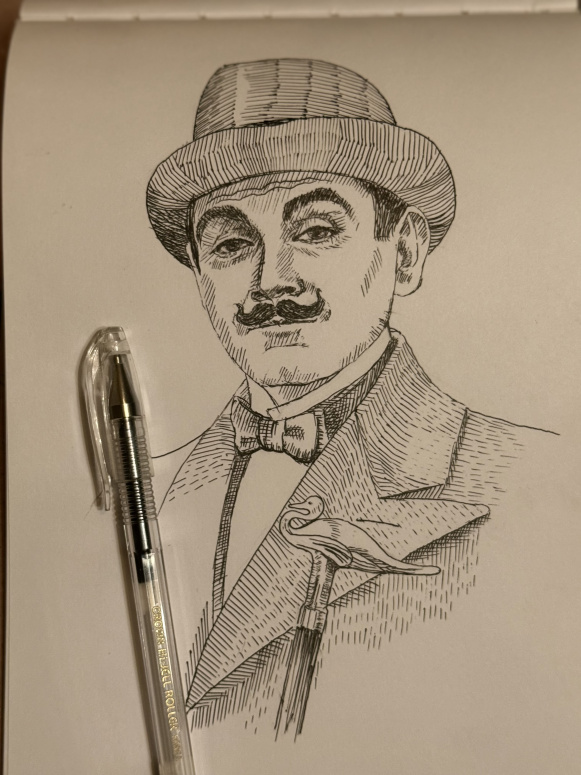 Первый вариант грустно лежит в скетчбуке))) Может быть, потом донесу. Его нормально не отсканировать, он блястячий)) До нормального леттеринга мне еще грести и грести, назовем это работой со шрифтами) Далишные усы прекрасны. Я вот после двух вариантов усов Пуаро задумалась об усах из Деревни Дураков, но горшочек не вари все-таки!)) |