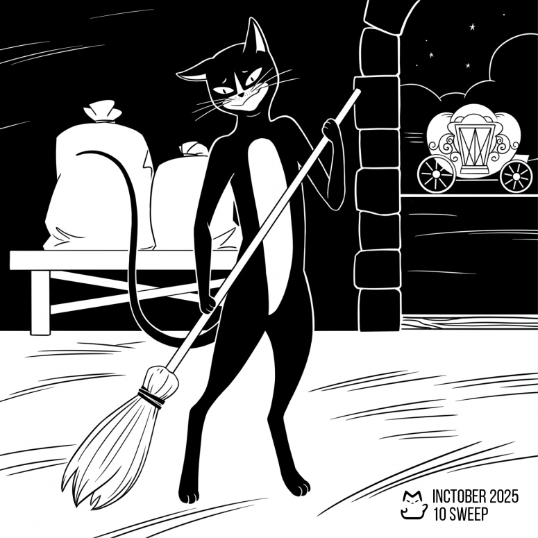 Кот Федот помогает Золушке с клинингом. Inktober2025-10-подметать