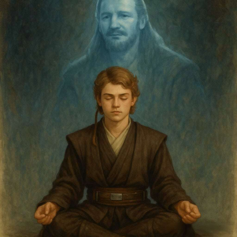 По-моей задумке Энакину здесь лет 13-14. Он не слишком усидчив, но на этот раз решил помедетировать. Ну а Квай-Гон за ним присматривает)