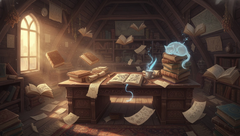 #кот #магия #чердак #книги #перо #свет