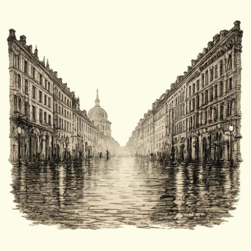 Арт к стихотворению «Воды Петербурга». Мокрая дорога городской улицы.
