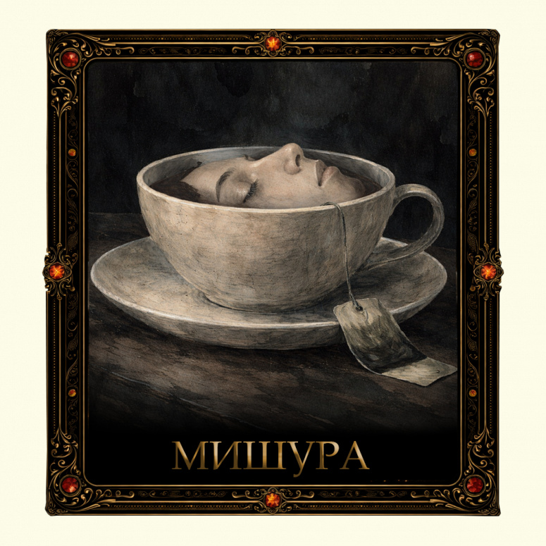 Арт к стихотворению «Мишура». Остывший чай с уснувшим лицом. Лёгкий психологический ужас.
