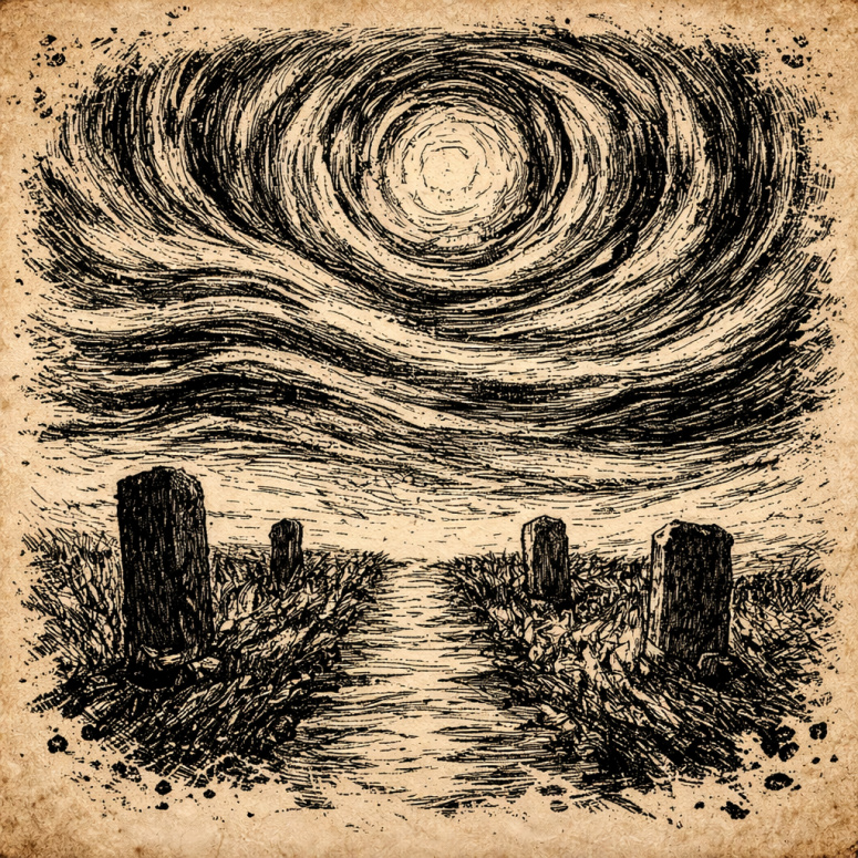 Арт к стихотворению «Эволюция». Сюрреалистичное небо над могилами.