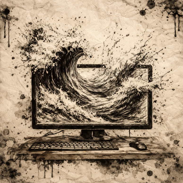 Арт к стихотворению «Монитор». Волны переливаются через экран. Чернила на древнем пергаменте.