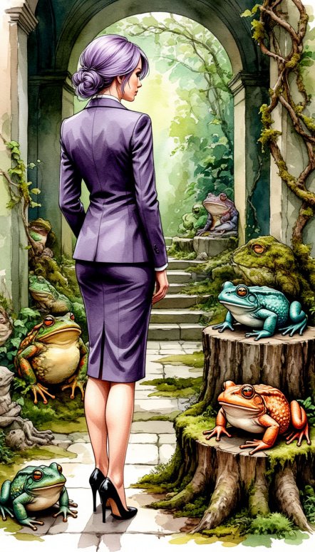 По залу в беспорядке были расставлены древесные пни и кочки, замшелые, поросшие травой и мелкими цветочками. И на каждой кочке с удобством разместились глиняные разноцветные лягушки, — самые яркие пятна в этом серовато-болотно-мшистом разнообразии, — глянцево блестящие и беспорядочно вращающие большими выпуклыми глазами. Они были и большими, почти размером с кошку, и совсем мелкими, но явно рукотворными, а ещё пугающе живыми. Берта сделала шаг, чтобы миновать лягушек, но ближайшая из них, разинув пасть, выстрелила вперëд длинным языком, вылавливая в полëте мелкую мошку и вынуждая отступить назад.