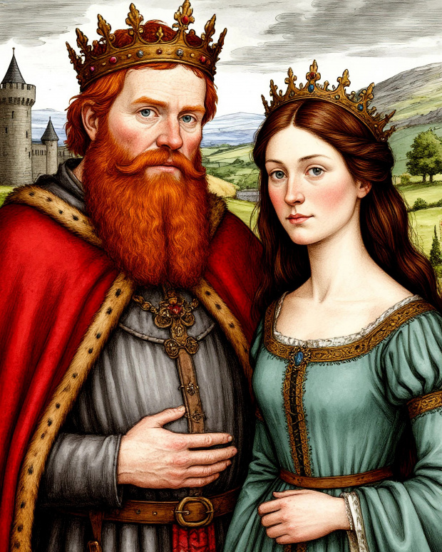 Маргарита не была юна — лет двадцать пять, может, чуть более. Но подле Малькольма она казалась почти девочкой. Причина крылась не в том, что Малькольм был приблизительно вдвое старше ее, а в разительном несходстве их обликов и нравов. Она — словно декоративная фигурка, изваянная из мрамора: стан тонкий, кожа белее молока, подбородок острый, очи серые, в коих затаился испуг. Темно-русые локоны обрамляли лик. Маргарита сидела прямо, сложив длани на коленях. Он же — суровый муж, с в меру тучным телосложением и грубоватыми, небрежными повадками. Малькольм жевал ножку фазана и беседовал с поданным, не стыдясь говорить с полным ртом. Порой он похрюкивал от смеха.