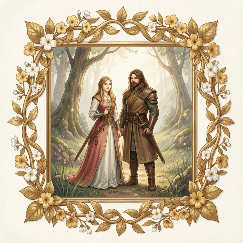 Арвен и Арагорн в Лориэне. Старинная иллюстрация в светлых и мягких тонах. Рама из переплетённых золотых листьев, белых первоцветов и золотых цветков, похожих на цветы вишни.