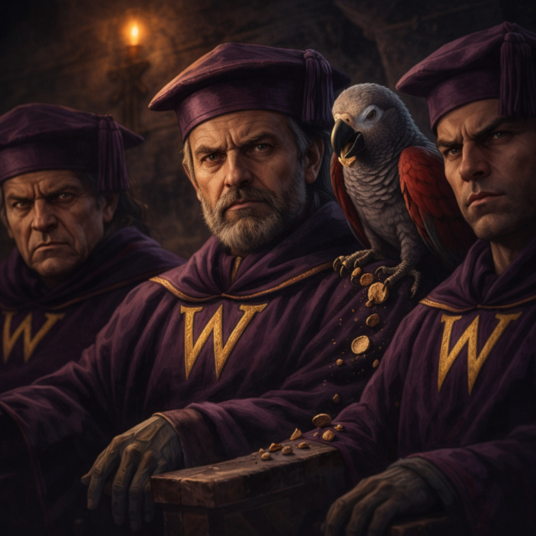 И, как Гарри уже успел заметить, у одного из них на плече сидел попугай — огромная серо-алая птица, которая с хрустом раскалывала орехи мощным клювом и с грохотом роняла скорлупу на каменный пол".