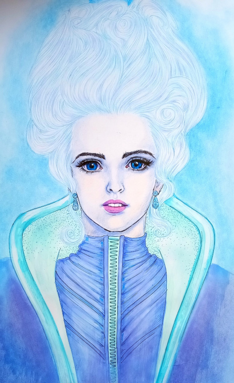 Высокий лоб обрамляли волосы, похожие на взметнувшийся и застывший снежный сугроб. Тени на лице отливали лёгкой синевой. На этом лице самым примечательным были глаза. Неестественно огромные, большие ресницы обрамляли белки с фиолетовым оттенком, в ясно очерченных бирюзовых геммах зрачков мерцали тёмные точки...