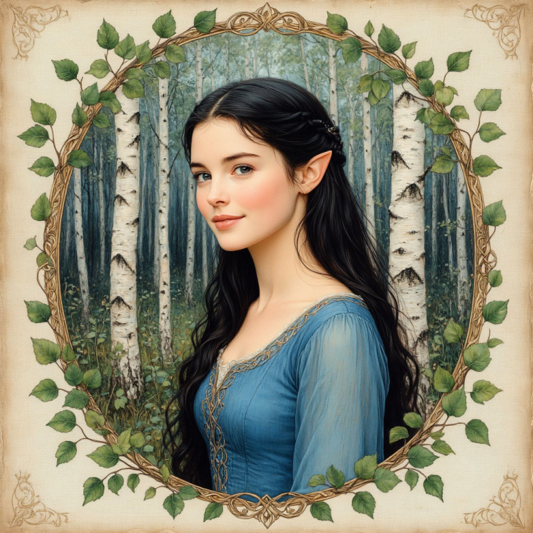 Юная и нежная Арвен (Лив Тайлер) в голубом платье. Лёгкая задумчивая улыбка. На фоне весенних берёз. Тонкая рама с эльфийским орнаментом и зелеными листиками. Весенние сумерки. Старинная иллюстрация. Состаренное изображение.