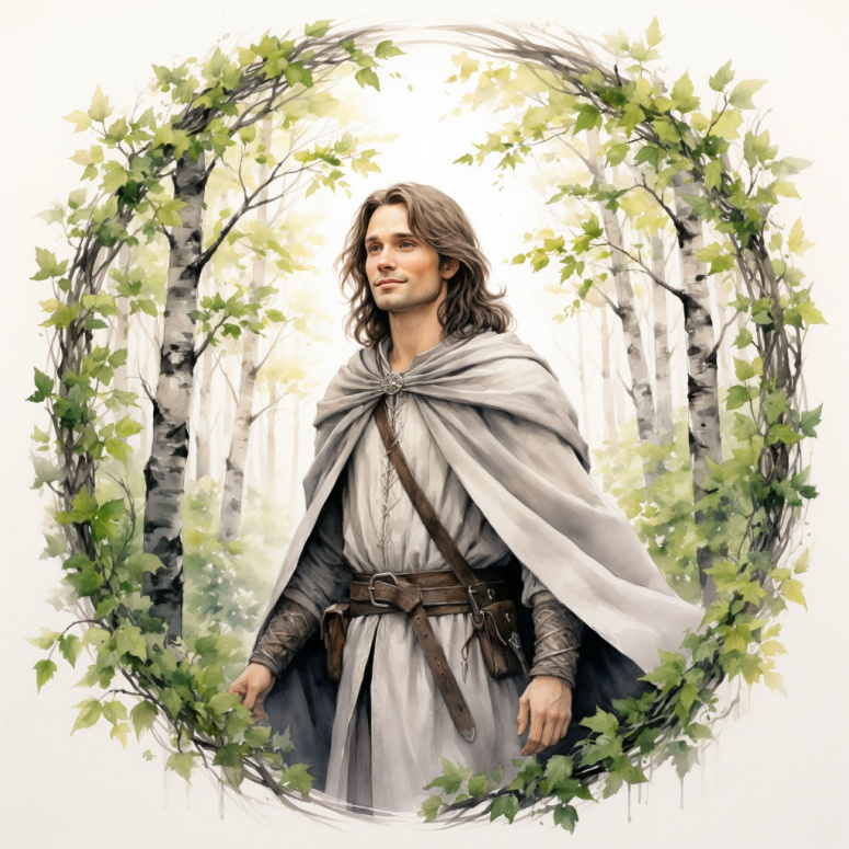 Портрет юного двадцатилетнего Арагорна на фоне весенних берёз. Арагорн в светло-сером плаще. Лёгкая улыбка, удивление и радость. Тонкая рама с эльфийским орнаментом и зелеными листиками. Весенние сумерки. Старинная иллюстрация.