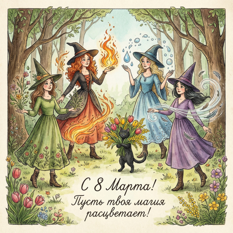#магия #ведьмы #нейросеть #весна #открытка #цветы #кот